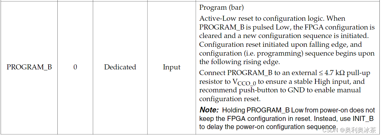 我们直接找PROGRAM_B和INIT_B这两个信号的说明。下面是PROGRAM_B这个信号。有一个note,说即便把这个引脚拉低也不能保持FPGA处于复位状态,可以考虑的是,使用INIT_B引脚可以延后调整芯片的上电配置时间。