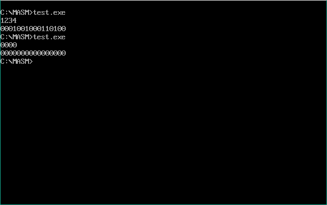 code segment assume cs:code start: mov bx,0 mov ch,4 mov cl,4 s0: mov ah,1 ;输入4个16进制数 int 21h cmp al,39h ;判断 0~9 or A~H jbe next sub al,07h next: sub al,30h shl bx,cl add bl,al dec ch jnz s0 mov cx,16 ;显示 mov dl,0AH ;换行 mov ah,02H int 21H s1: mov dl,0 rol bx,1 ;最高位入CF adc dl,30h mov ah,02h int 21h loop s1 mov ax,4c00h int 21h code ends end start