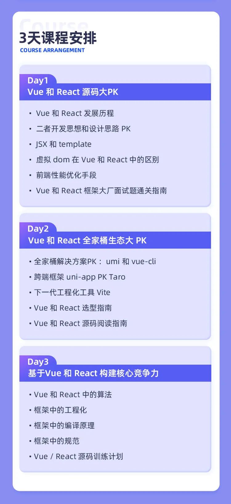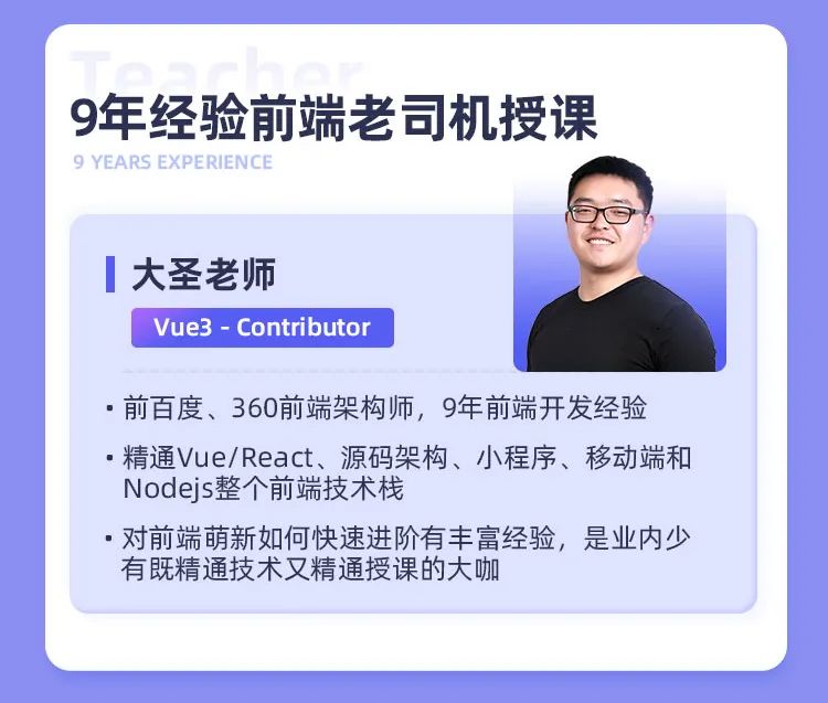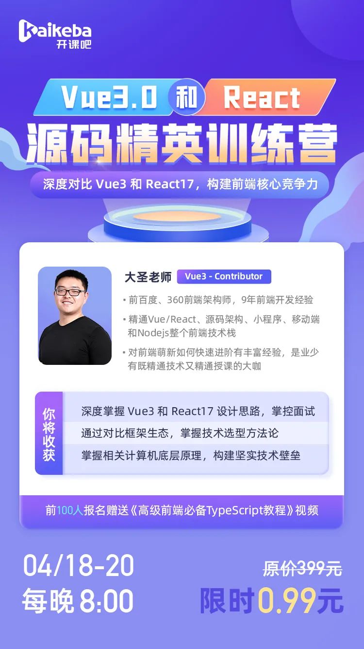 因此给大家推荐一个由前百度、360架构师,Vue3.0 Contributor 大圣老师主讲的《Vue3.0 和 React17 源码精英训练营》直播课程,从二者框架原理,到如何阅读源码,再到源码训练,全方面提升你的源码技能,构造你个人的前端技术护城河。