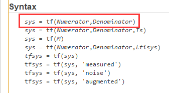 >> Numerator = {[1 1] ; 1}; >> Denominator = {[1 2 2] ; [1 0]}; >> H = tf(Numerator,Denominator,'InputName','current',... 'OutputName',{'torque' 'ang. velocity'},... 'Variable','p') H = From input "current" to output... p + 1 torque: ------------- p^2 + 2 p + 2 1 ang. velocity: - p Continuous-time transfer function.