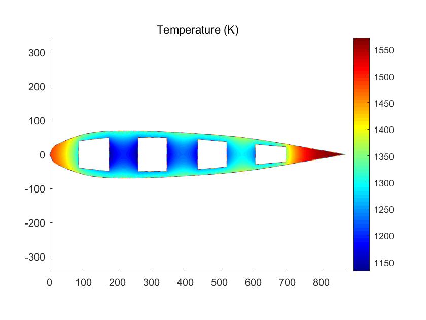 讯享网% Plot T in triangles figure; for ii = 1:Nt, for nn = 1:3, xtri(nn,ii) = xy(1,tri2nod(nn,ii)); ytri(nn,ii) = xy(2,tri2nod(nn,ii)); Ttri(nn,ii) = Tsol(tri2nod(nn,ii)); end end HT = patch(xtri,ytri,Ttri); axis('equal'); set(HT,'LineStyle','none'); title('Temperature (K)'); % caxis([298,1573]); colormap(jet); HC = colorbar; hold on; bladeplotgrid; hold off;