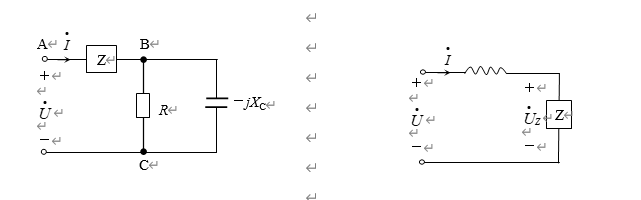 3、已知左下图所示电路中,R=XC=10Ω,UAB=UBC,且电路中路端电压与总电流同相,求复阻抗Z。