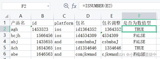 比如在F2单元格输入=ISNUMBER(E2),当E2是数值型数字时,会返回TRUE,否则会返回FALSE。由于E2是数值型数字所以返回TRUE,而E3是文本形式的数字所以返回FALSE,E4为英文文本字符串,所以返回为FALSE。
