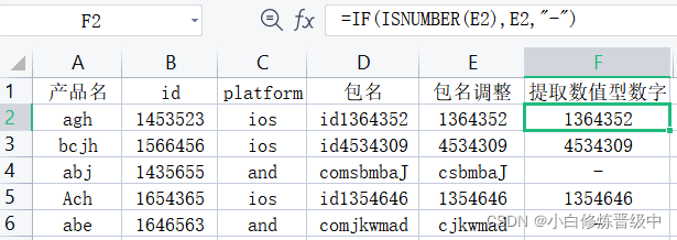 比如获取E列中数值型数字的值,E2单元格输入“=IF(ISNUMBER(E2),E2,"-")”,点击回车,下拉公式,则提取数值型数字的数值,如下图所示。 “IF(ISNUMBER(E2),E2,"-")”表示如果ISNUMBER(E2)判断为TRUE(即E2为数值型数字),则返回结果E2,否则返回结果“-”。