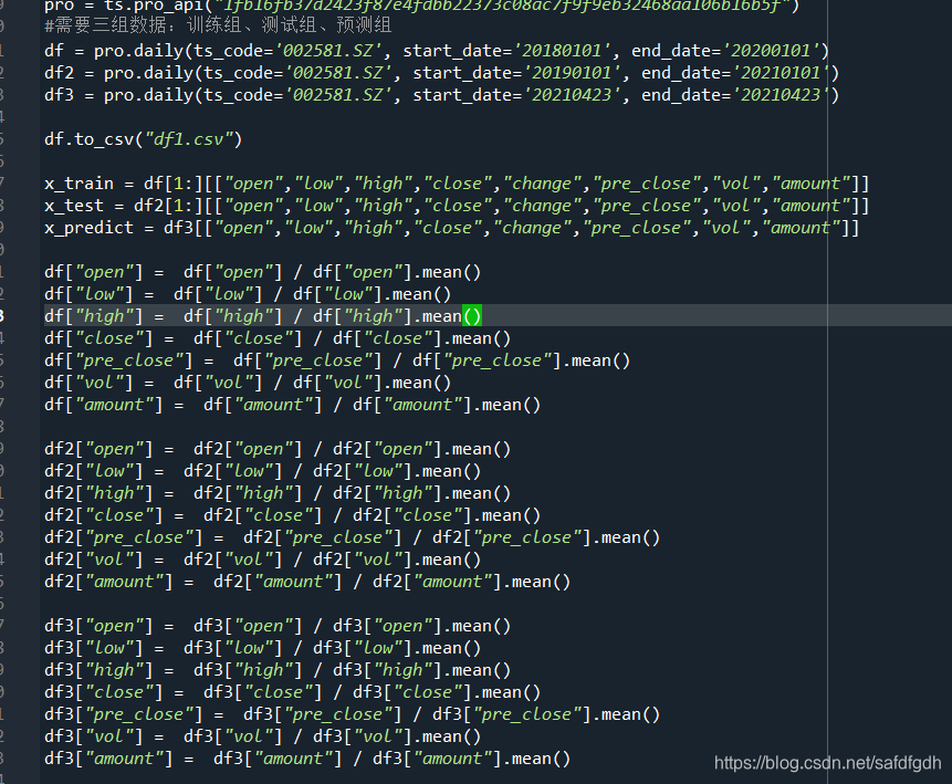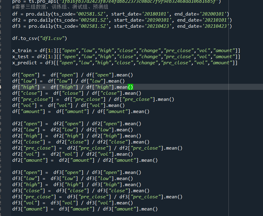 3、继续选取002581未名医药的股票作为实验数据,分别选取2018年1月1日到2020年1月1日的数据作为训练集,2019年1月1日到2021年1月1 日的数据作为测试集,选取2020年5月7日到2021年5月7日的数据作为predict来检验模型预测情况。