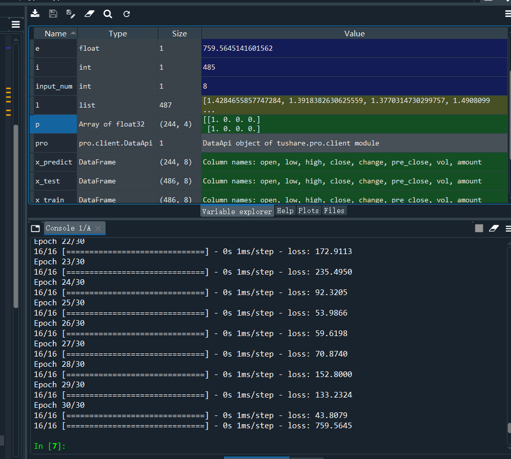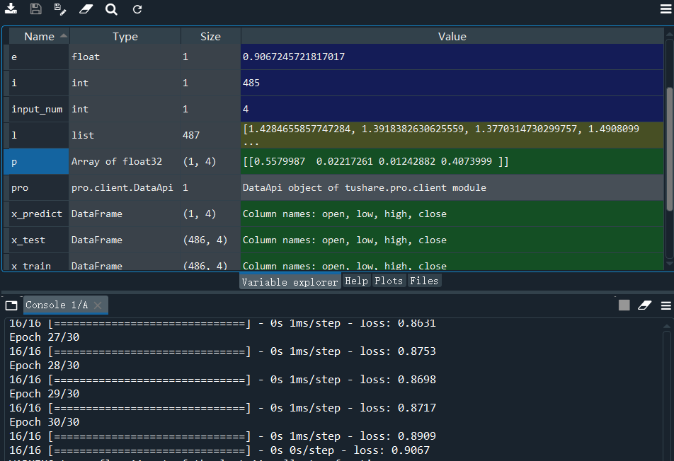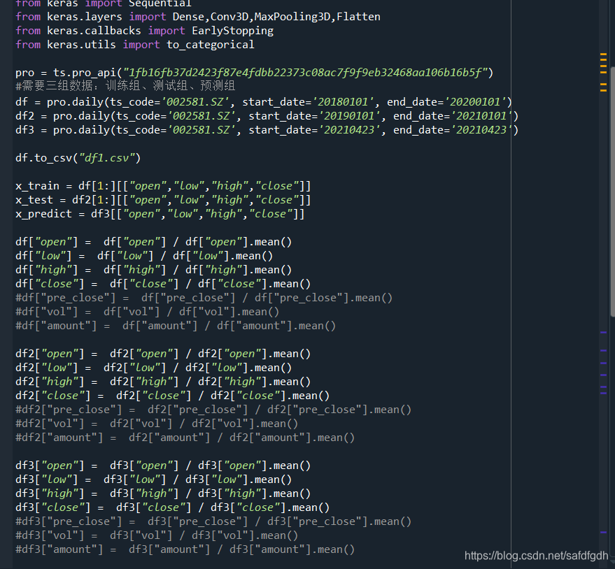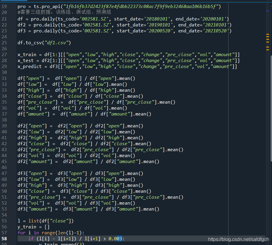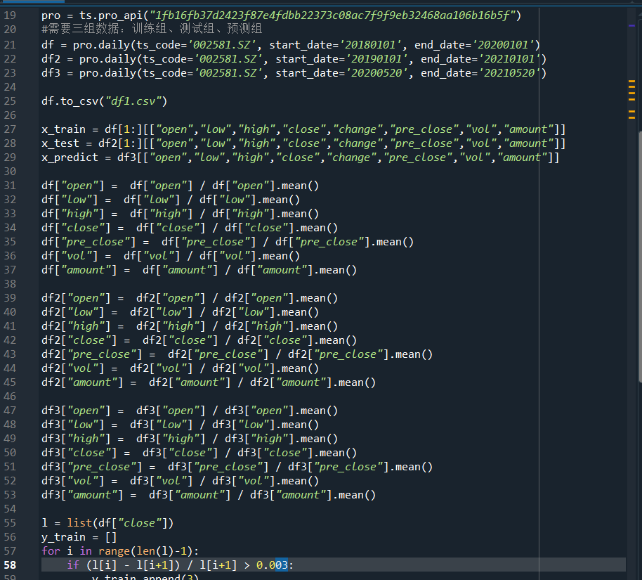 选取002581未名医药的股票作为实验数据,分别选取2018年1月1日到2020年1月1日的数据作为训练集,2019年1月1日到2021年1月1 日的数据作为测试集,选取2021年4月23日当天的数据作为predict来检验模型预测情况。设定涨幅大于0.3%,0.2%,0%的界限。