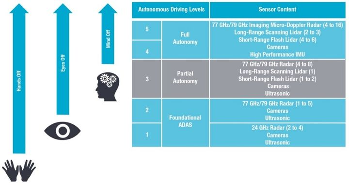 ↑↑↑ 自动驾驶分级和对应所需传感器技术