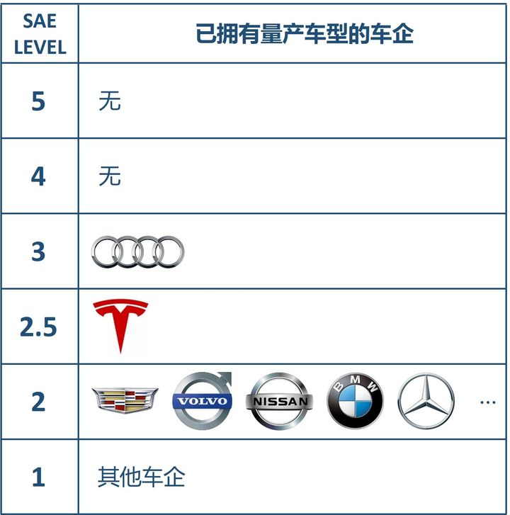 先来一张各大车企自动驾驶技术的分级图,大致了解一下目前已经量产的自动驾驶技术哪家强。