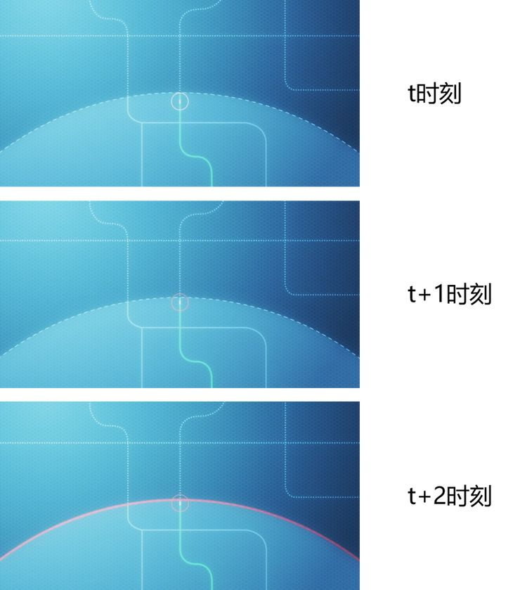 t+2时刻,汽车开出了边界,这时自动驾驶系统完全失效,安全停车。