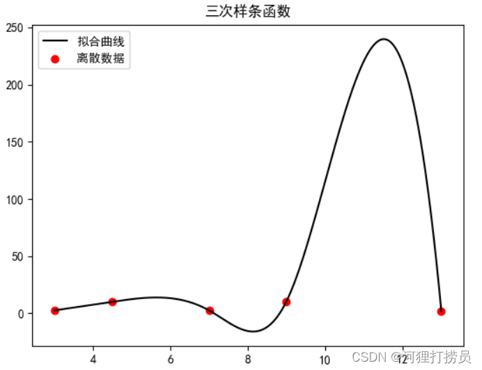 三次样条曲线的特点是由多个三次多项式组成,每个多项式在相邻数据点之间的区间上进行插值。这些多项式要满足插值条件和平滑条件,使得曲线在数据点之间变得光滑。