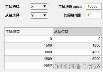 主轴选择X轴,从轴选择Y轴,设定主轴转动一周需要6000puu,从轴转动一周需要6000puu,当主轴转动10周时从轴转动1周,主轴速度为1000puu/s;并设定从轴经过图中所示的5个点。