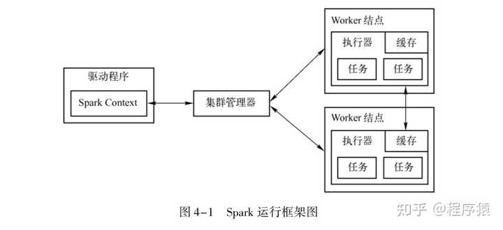 Spark 调度器的设计体现得非常简洁清晰和高效, 其输入是 Spark RDD, 输出是 Spark 执行器 (Executor)。 正是 Spark 调度器的设计思想极大地区分出了基于 MapReduce 模型的 Ha⁃doop 和基于 DAG 模型的 Spark。 本章将分别阐述 Spark 调度器各个重要组件的机制和原理,结合 Spark 调度器的源代码实现, 详细解析 Spark 调度器的实现细节, 主要内容包括 Spark运行核心概念、 Spark Driver Program 剖析、 Spark 作业 (Job) 的触发、 高层的 DAG 调度器(DAGScheduler)、 底层的 Task 调度器 ( TaskScheduler) 和调度器的通信终端 ( Scheduler⁃Backend)。4. 1 Spark 运行的核心概念4. 1. 1 Spark 运行的基本对象根据前面的阐述可知, RDD 其实就是 Spark 运行的基本对象。 关于 RDD 的定义和运行机制, 在第 1 章和第 2 章分别给予了详细阐述。 这里重新总结下 RDD 的一些重要特征和创建方式, 以方便后面对整个 Spark 调度器 (Scheduler) 的运行机制的理解。RDD 是一种数据模型, 与分布式的共享内存类似。 RDD 有以下几个特征。●是只读的内存数据, 但可以持久化。●是可以分区的数据集合。●是一个对象, 可以调用它的方法执行一些变换操作 ( Transformation ), 如 flagMap、filter 等。●是可恢复的。 与数据多副本的备份方式不同, RDD 的恢复可以通过重复执行变换操作 (Transformation ) 得到。●变换操作 (Transformation) 是延迟操作, 只有在真正需要时才执行。有下列两种方式可以创建 RDD。●从持久化的数据上创建, 如硬盘和 HDFS 上的文件。●从其他 RDD 上通过变换 (Transformation ) 操作创建。说明: RDD 本身是与编程语言无关的, 既可以用 Scala 语言实现, 也可以用 Java、 Python 等其他编程语言实现。 当初决定用 Scala 就是因为用它写的代码简单明了。4. 1. 2 Spark 运行框架及各组件的基本运行原理本章默认讲解的内容都是基于 Spark 的 Standalone 部署模式。 在 Standalone 部署模式下,Spark 比在 YARN 和 Mesos 更容易使用, 因为不需要其他的东西。 如果是基于 Spark 来处理数据, 基本上一个 Spark 框架就可以了, 无须使用 YARN 或者 Mesos 等 (如果掌握了 Standa⁃lone 模式, 掌握 Yarn 或者 Mesos 是没有问题的, 因为它们 80% 的原理都是类似的)。如图 4-1 所示, SparkContext 在创建 DAGScheduler、 TaskScheduler、 SchedulerBackend 的同时还会向 Master 注册程序。 如果注册没有问题的话, Master 通过 Cluster Manager 会给这个程序分配资源, 然后根据 Action 触发 Job。 Job 里面有一系列 RDD, DAGScheduler 从后往前推若发现是宽依赖的话, 就划分不同的 Stage。 Stage 划分完成之后, Stage 提交给底层的调度器 TaskScheduler, TaskScheduler 拿到这个 Task 的集合。 因为一个 Stage 内部都是计算逻辑完全一样的任务, 只不过是计算的数据不同。 TaskScheduler 就会根据数据的本地性, 将任务分配到 Executor 上去执行。 Executor 在任务运行结束或者出状况时, 肯定要向 Driver 汇报。 最后运行完毕之后, 关闭 SparkContext, 同时其创建的那些对象也要关闭掉。
