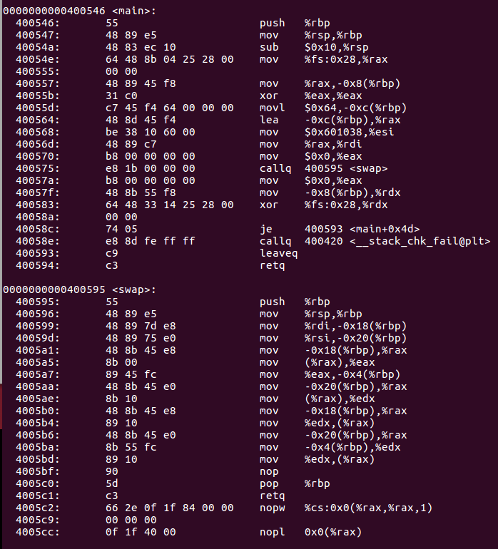 而在main中地址为的指令调用swap函数,此时后面四个字节是0x1b。之前说过0x1b代表偏移量,下一条指令的地址加上这个偏移量才是真正要调用的地址,计算得到40057a+0x1b=。可以看到这正是swap函数的地址。