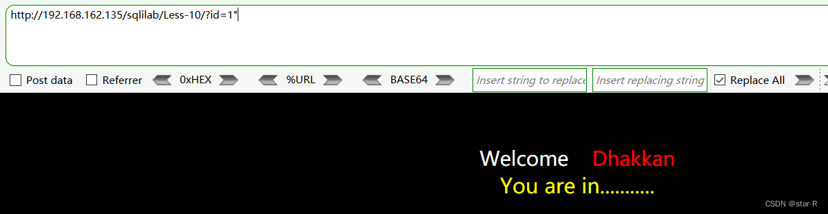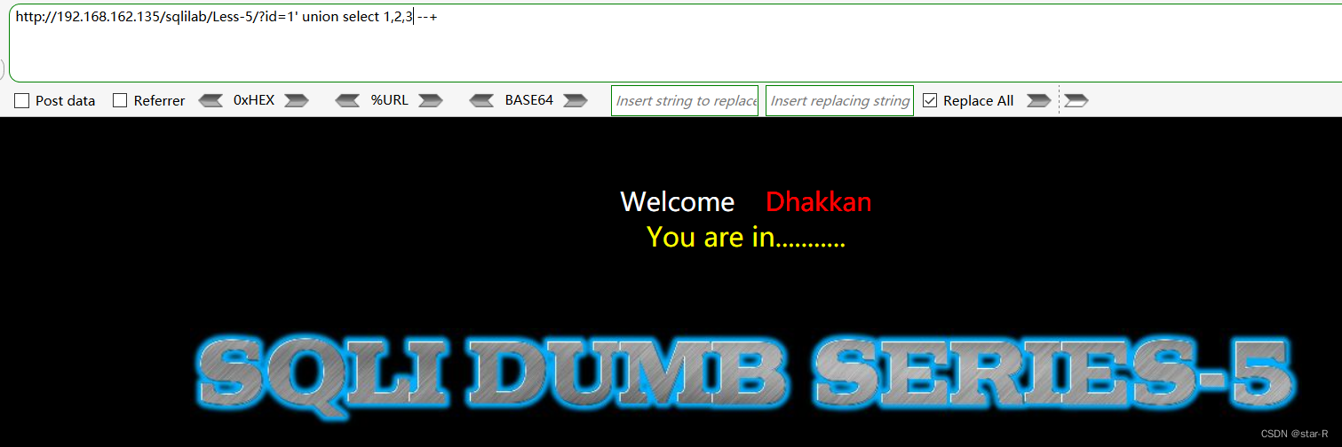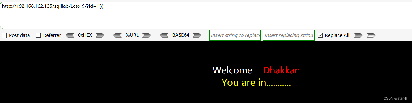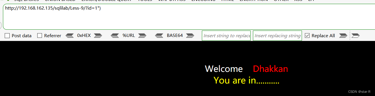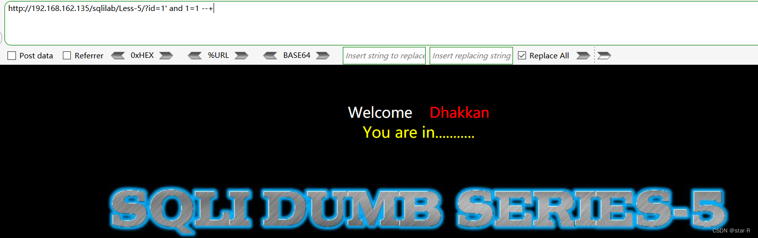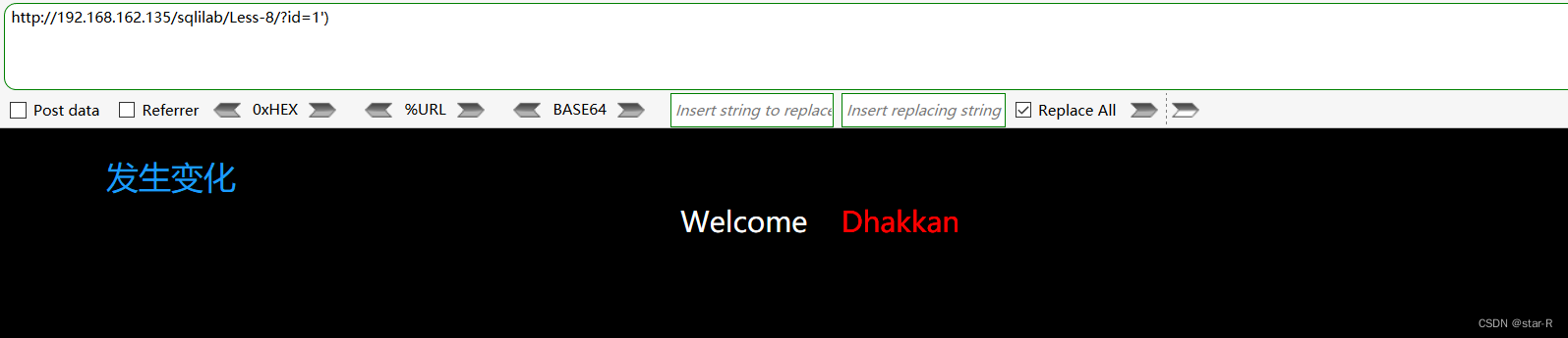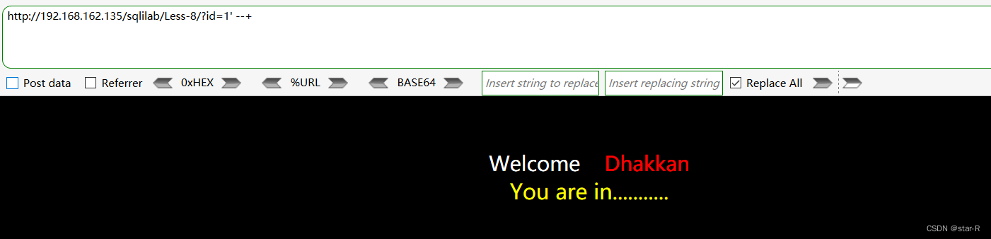 该注入点不显示任何信息,只能通过页面的变化来进行猜测,当页面显示"You are in......",说明为true,页面只显示"welcome",说明为false;因此在这关使用布尔盲注进行暴库、暴表