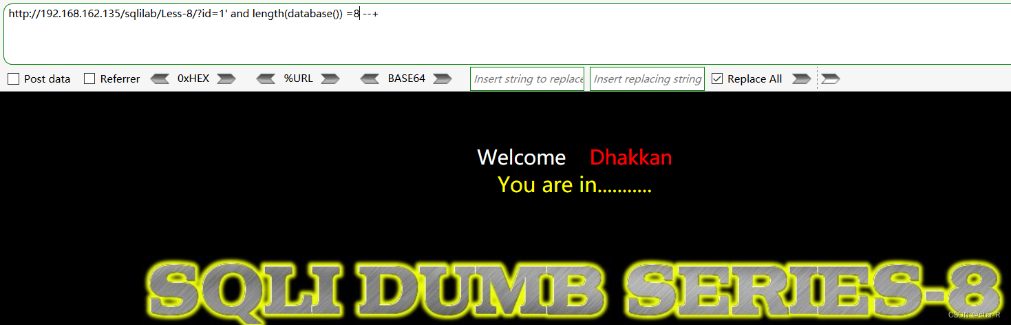 讯享网http://192.168.162.135/sqlilab/Less-8/?id=1' and length(database()) =2 --+
