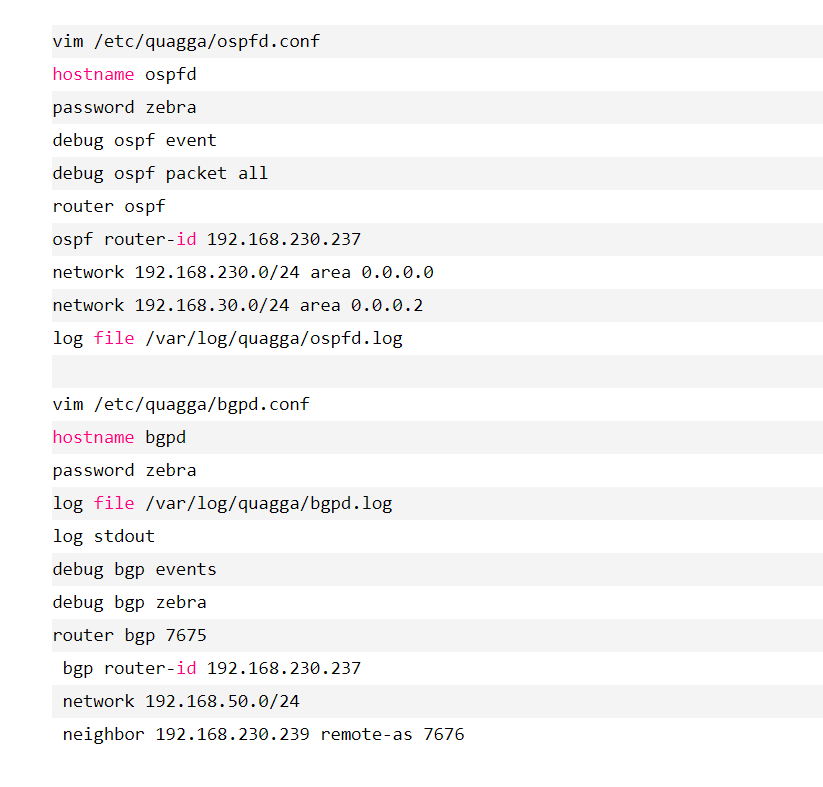 由于Quagga采用模块化的设计,因此Quagga运行时要运行多个守护进程,包括ripd ripngd ospfd ospf6d bgpd 和Zebra。