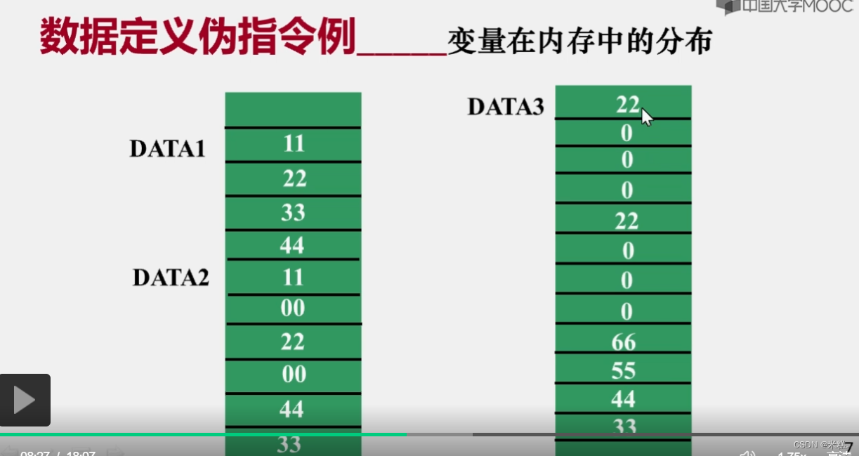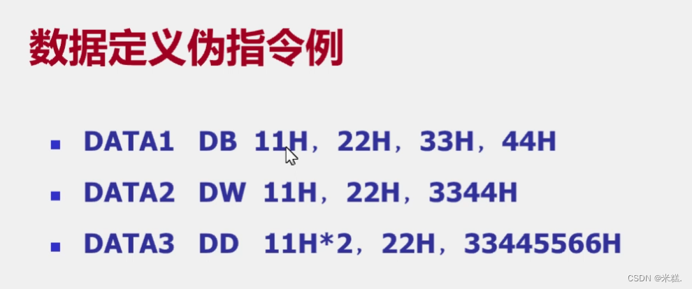举个例子,第一句中 DATA1被定义为字节类型的变量,那么他后面的每一个操作数都是一个字节,DATA2被定义成字类型的变量,所以后面的11H其实是0011H,DATA3被定义成双字类型变量,泽塔后面的每一个操作数都是占四个字节,第一个操作数应该是0000 0022H