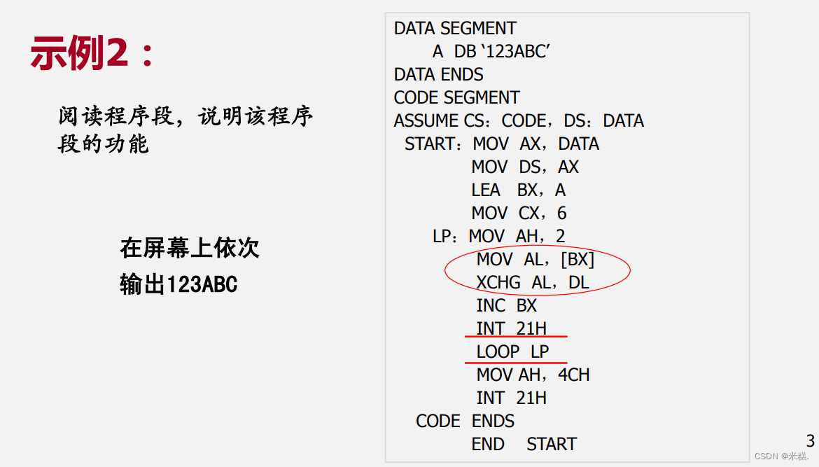 首先定义了一个数据段,然后在数据段定义了一个名字是A的字节类型变量,获得系统分配的内存中依次存放123ABC的ASCLL码值,然后DATA ENDS,紧接着有定义了代码段,用ASSUME把定义的逻辑段和他们对应的寄存器联系起来,然后是寄存器的初始化。在阅读代码的时候后我们发现关键的一句是INT 21H,"INT 21H"指令用于调用DOS提供的功能和服务,其中"21H"表示调用的功能号。通过设置寄存器AH来指定具体的功能号,可以调用不同的DOS功能。然后就要往上面找看看AH里面是什么,发现AH里面是2,表示调用的是单字符显示功能,由于单字符显示的是DL里面的内容,因此我们现在应该分析DL里面的内容是什么,MOV AL,[BX]表示把BX指向的内容送到了AL里面,XCHG AL,DL表示交换AL和DL的内容,因此DL里面存放的就是BX指向的内存空间中的内容,因为前面LEA BX,A是把A的地址拿出放到BX里,注意A并不是内容,而是一个变量或者说是符号地址,他里面存放的内容是123ABC,因此第一次执行完INT 21H这一句会把字符1打印在屏幕上,LOOP会把CX自动减一并再次从LP执行,直到CX为0,因此最终执行结果是123ABC依次出现,注意不是同时出现,因为这里是单字符显示。一次只能显示一个。