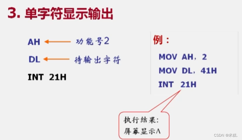 对于前面的单字符输入和字符串输入,他们的入口就是键盘,因此我们需要给他一个出口,其实就是缓冲区,而对于单字符显示输出,他的出口就是屏幕,因此我们需要给他一个入口,汇编语言规定入口是DL,因为对于单字符来说他就是一个8位的ASCII码值。之所以叫单字符显示输出,是因为在用DOS软中断的字符显示输出时,他会把DL里面的内容解释称ASCII码值,因此上面执行结果是A