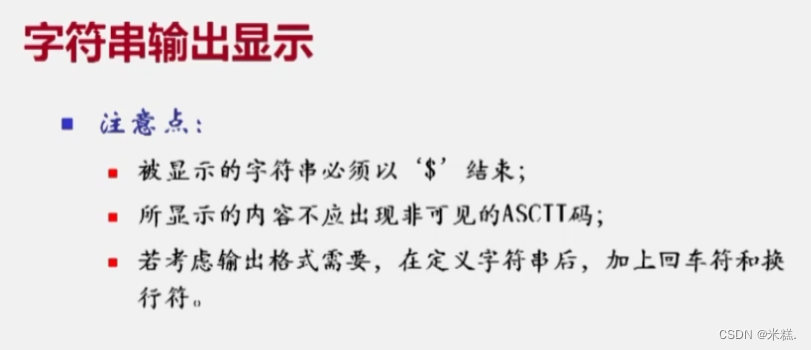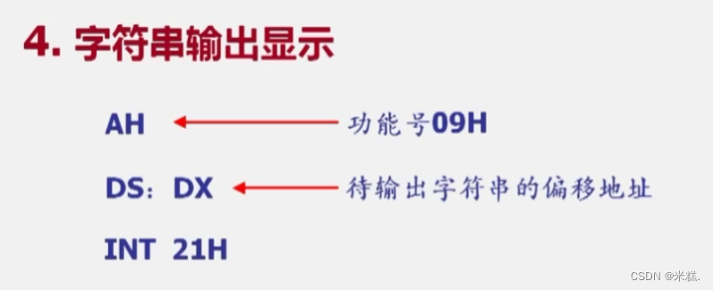 在前面学习中我们说只有四个寄存器BX BP SI DI,他们被称为间址寄存器,但是这里DOS软中断的时候用的是DX存放字符串在内存中的地址。这是规定。