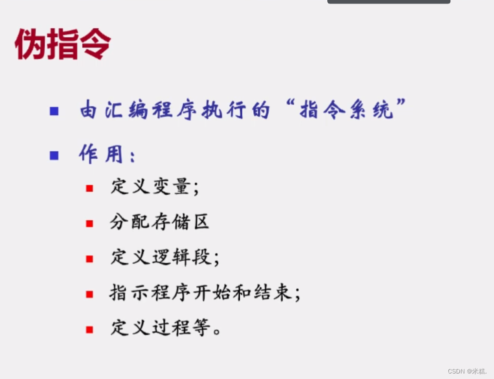 伪指令是一些看起来像指令,但实际上并不是CPU可以直接执行的指令。它们更像是一种特殊的命令,由汇编器(或编译器)处理。