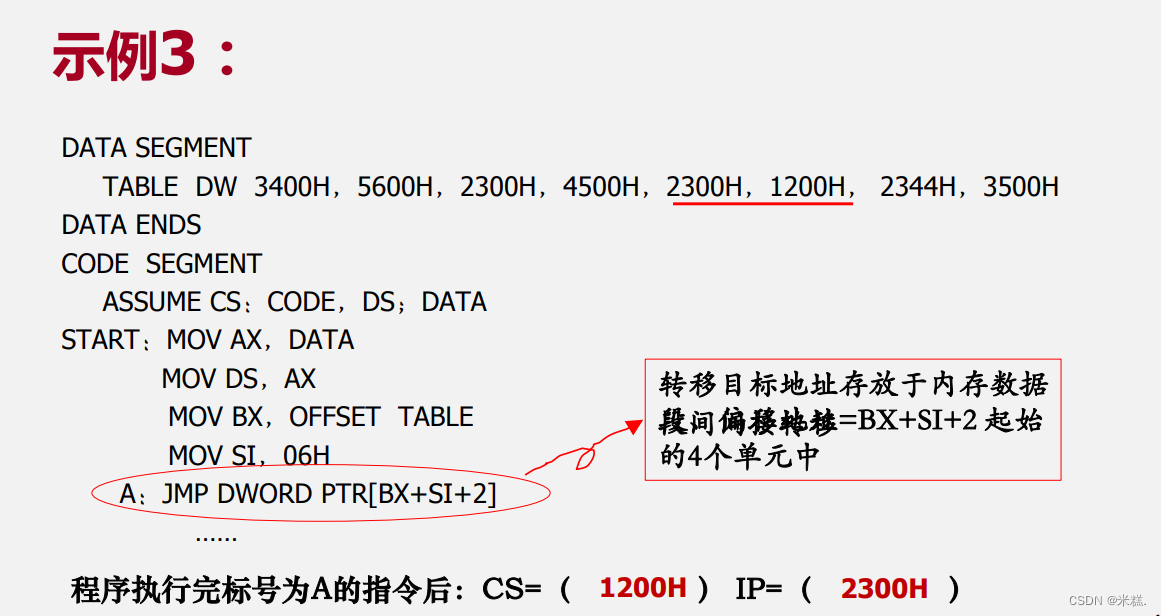 这个代码中最主要的一句就是红圈圈起来的这句,表示[BX+SI+2]采用基址变址相对寻址的方式,总而言之[]里面是一个地址,DWORD PTR[]表示把这个地址指向了一个双字,通过[]找到了这个双字并把它解释成一个地址,由于这个地址是双字也就是32位的,因此是段间转移,目标地址在BX+SI+2起始的四个单元中,BX是TABLE的偏移地址,而TABLE是我们定义的逻辑段的名字,默认偏移地址是0,SI是06H,因此目标地址的起始地址是从TABLE开始往后数8个字节单元,所以JMP之后的一个双字是2300H,1200H,这个双字被解释称一个地址,高地址存放在CS中,低地址存放在IP中。