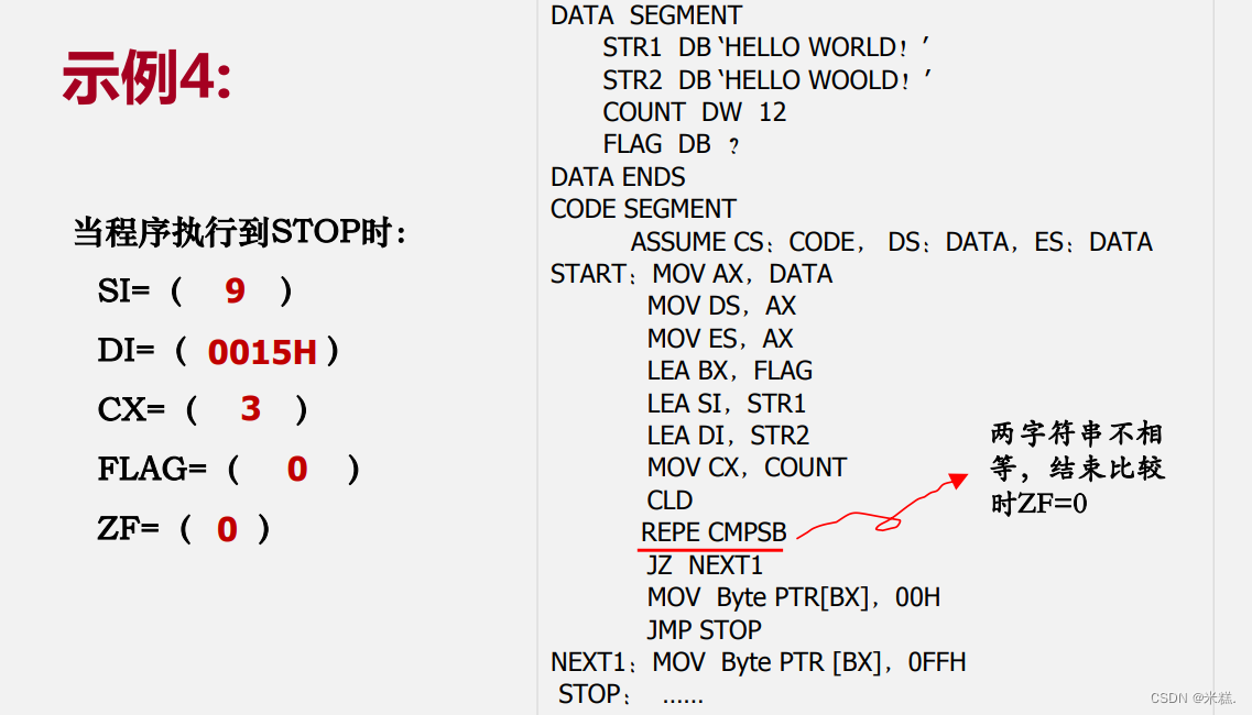 CMPSB是把DS:SI和ES:SI指向的内容进行比较,现在SI指向了STR1首元素,DI指向了STR2首元素,因此第一次比较的是H和H,二者相同,注意其实不管相同还是不同,都会使SI和DI+1并且CX-1,前面有前缀REPE表示相同则重复,直到比较的东西不同或者CX=0为止。因此直到比较R和O才停下来,H是STR1的零地址,因此直到比较R和O,SI应该是8,但是比较完之后不管相等还是不等SI和DI会自动+1,因此SI最终是9,因为STR2的首元素在12地址处,因此O在20地址处,比较完之后+1,故DI应该是21即0015H,因为比较了八次,每次比较CX都-1而且第八次比较完之后CX也-1,因此CX=12-9=3.因为在REPE CMPSB停下来之后两个内容不相同,所以ZF=0,因为JZ是在ZF=1的条件下才会跳转到NEXT1,因此不会跳过去,而是继续执行下一条MOV指令,把00H送到BX指向的字节单元中,而BX指向的字节单元是FLAG,因此FLAG=0。