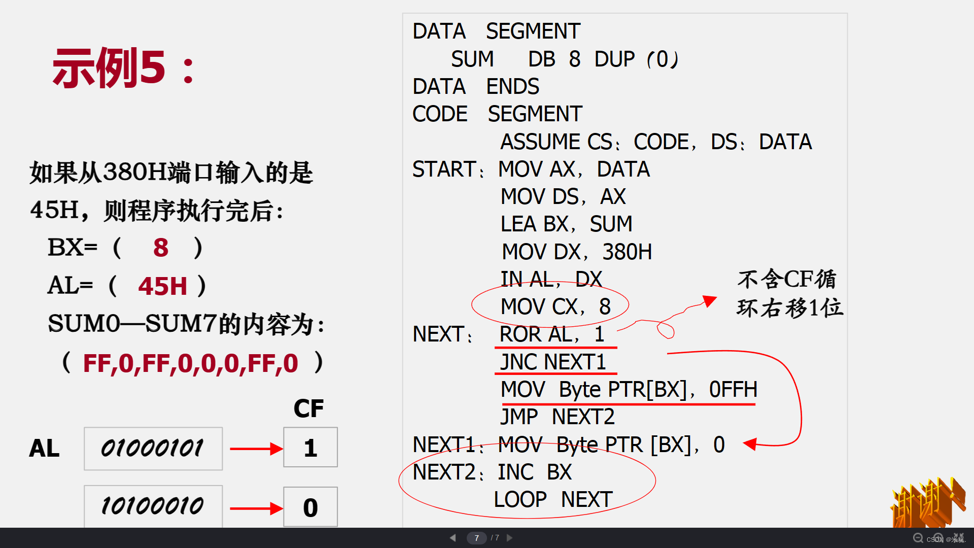 回到本题,在第一次执行完ROR AL,1之后,即把AL里面存放的内容45H右移一个二进制位同时把移出去的那一位放在CF里面的同时把它放到第一位。现在CF里面放的是1,JNC表示CF为零则跳转,因此这里不会跳转,而是把OFFH放到了BX指向的字节单元也就是SUM0当中,因为CF里面的内容是1还是0,与当前AL中二进制序列的最后一位有关。最后一位是1,执行ROR之后CF就是1,CF是0,执行ROR之后CF就是0。而如果是0,执行完ROR之后就跳转到了NEXT1处并把0送给BX当前指向的字节单元,因此最终SUM0~SUM8分别是FF,0,FF,0,0,0,FF,0。不管跳转与否,每次都会执行NEXT2,每次都会把BX+1,因此执行了八次最终BX=8。而AL本身是八位二进制码,他右旋八次相当于没变,因此最终AL仍然是45H。