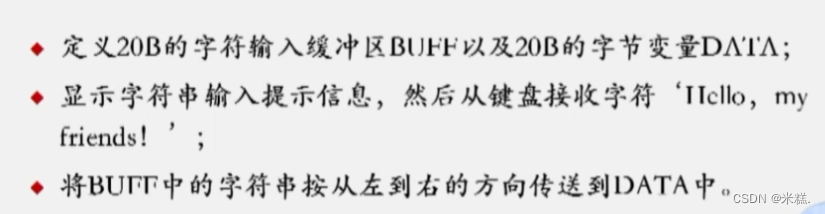 首先DSEG SEGMENT 定义了一个数据段,然后在里面创建了一个名为MESS的字节类型变量,现在MESS就是一块内存空间的首地址,他指向的字节单元里面依次存放着Please等等这样一个字符串,然后还放上了回车符和换行符让形式上看起来更美观,最后字符串用$表示结束。然后是字符缓冲区的定义,N1=20,然后又定义了一个字节类型的变量DATA。DSEG ENDS表示数据段定义的结束。紧接着又是定义代码段并用ASSUME把我们刚才定义的逻辑段与他们对应的寄存器联系起来,我们说涉及到串操作的指令,必须把目标操作数放在附加段,而我们刚才并没有定义附加段,但是我们知道数据段和附加段是可以重叠的,为了编程的方便,我们直接就用ASSUME把ES也和DSEG联系起来即可。然后START后面三行就是寄存器的初始化,接下来三行是把以MESS为首地址的字符串打印在屏幕上。然后红色的三行是让我们在缓冲区BUFF中输入一串字符,这里调用的是DOS 21H功能包的10号功能,由于字符缓冲区的特殊性,我们输入的字符串实际上是从BUFF+2的地方开始的,而BUFF处存的是N1,BUFF+1处存的是N2,也就是我们实际输入的字符个数。因为我们后面要用MOVSB指令将ES:DI指向的字节数据复制到DS:SI指向的位置,并根据方向标志位DF的状态调整SI和DI的值。REP指令通常与字符串操作指令结合使用,例如MOVSB、MOVSW等。它的作用是让指定的字符串操作指令重复执行指定的次数,直到指定的CX减为零为止。因此我们就要先把我们实际输入的字符个数先传给CL,在这之前需要吧CX清零即异或自己。CLD 指令的作用是将 DF 清零,即将方向标志位设置为0。这样,在执行字符串操作指令(比如 MOVSB, MOVSW, SCASB, CMPSB等)时,操作方向会是从低地址到高地址。最后应该返回操作系统,即MOV AH,4CH INT 21H。