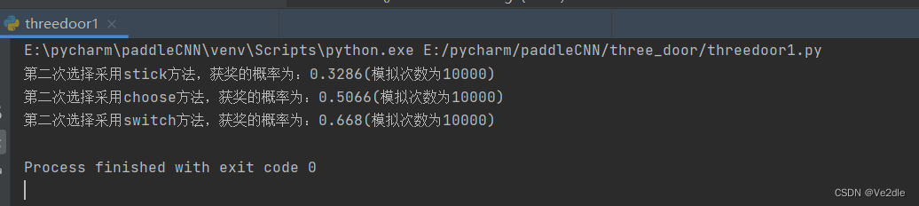 定义一个数组,里面装有三扇门,0,1,2,然后参赛者进行第一次选择,选择之后,假设参赛者选中的是0(参赛者不知道),主持人开启了另一扇门1或者2开出了羊,参赛者就要做出选择,保持原来的位置不变,或者去掉一个羊门后的两个门中,从剩下两扇门中随机做出选择,或者排除一扇空门后,放弃原来的选择,直接选择另一扇门;假设参赛者一开始选中的是1或者2,主持人开启了另一扇是羊门,即1或者2,此时参赛者仍然需要做出选择,可以仍然选择最开始的位置,或者去掉这一个羊门后的两个门中,从剩下两扇门中做抉择,或者排除一扇空门后,放弃原来的选择,直接选择另一扇门;在这期间我们不改变奖品的位置,一直在0号门,最终求的概率,次数训练一万次