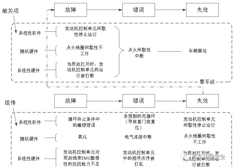 在组件层面,每个不同类型的故障会导致不同的失效。然而,组件层面的失效是相关项层面的故障。