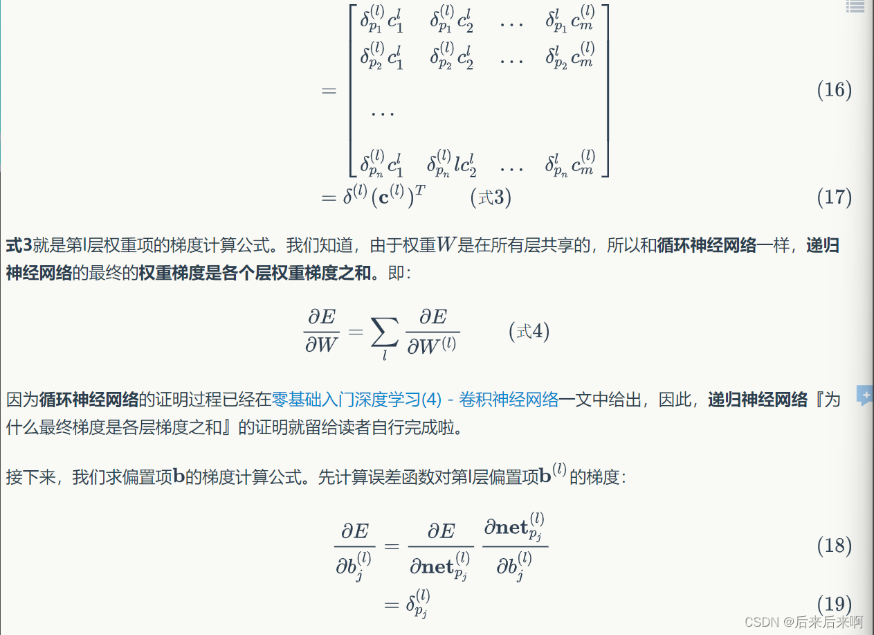 递归神经网络的训练算法和循环神经网络类似,两者不同之处在于,前者需要将残差从根节点反向传播到各个子节点,而后者是将残差δ从当前时刻tk反向传播到初始时刻t1。