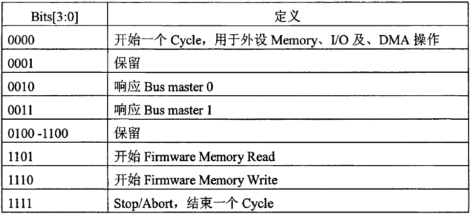 Start用于指示一个传输的开始或者结束。当FRAME#信号有效时,所有的外设都要监视LAD[3:0]信号,并在FRAME#信号有效的最后一个时钟进入START状态。LAD[3:0]的值编码如下表: