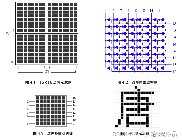 编写程序,控制点阵向上卷动显示“西安唐都科教仪器公司!3实验系统中的 16X16LED 点阵由四块 8X8 LED 点阵组成,如图 4.1 所示,8X8 点阵内部结构图如图 4.2 所示。由图 4.2 可知,当行为“1”,列为“0”,则对应行、列上的 LED点亮。图 4.3 为点阵外部引脚图。汉字显示如图 4.4 所示。