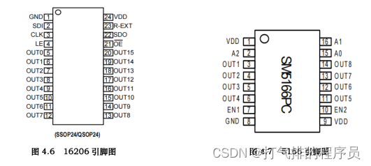 本实验采用 SM16206 作为列信号控制芯片,它是 LED 恒流驱动芯片,内建 CMOS 移位寄存器与锁存功能,可以将串行的输入数据转换成并行输出数据格式。其输出端口耐压可达+15V,因此可以在每个输出端申接多个 LED 灯;另外SM16206 高达2MHz的时钟频率可以满足系统对大量数据传输的需求。芯片引脚如图 4.6 所。