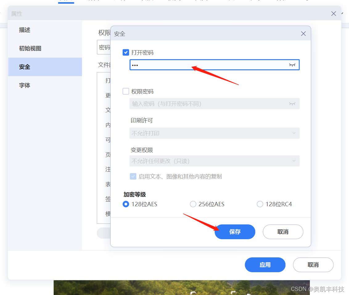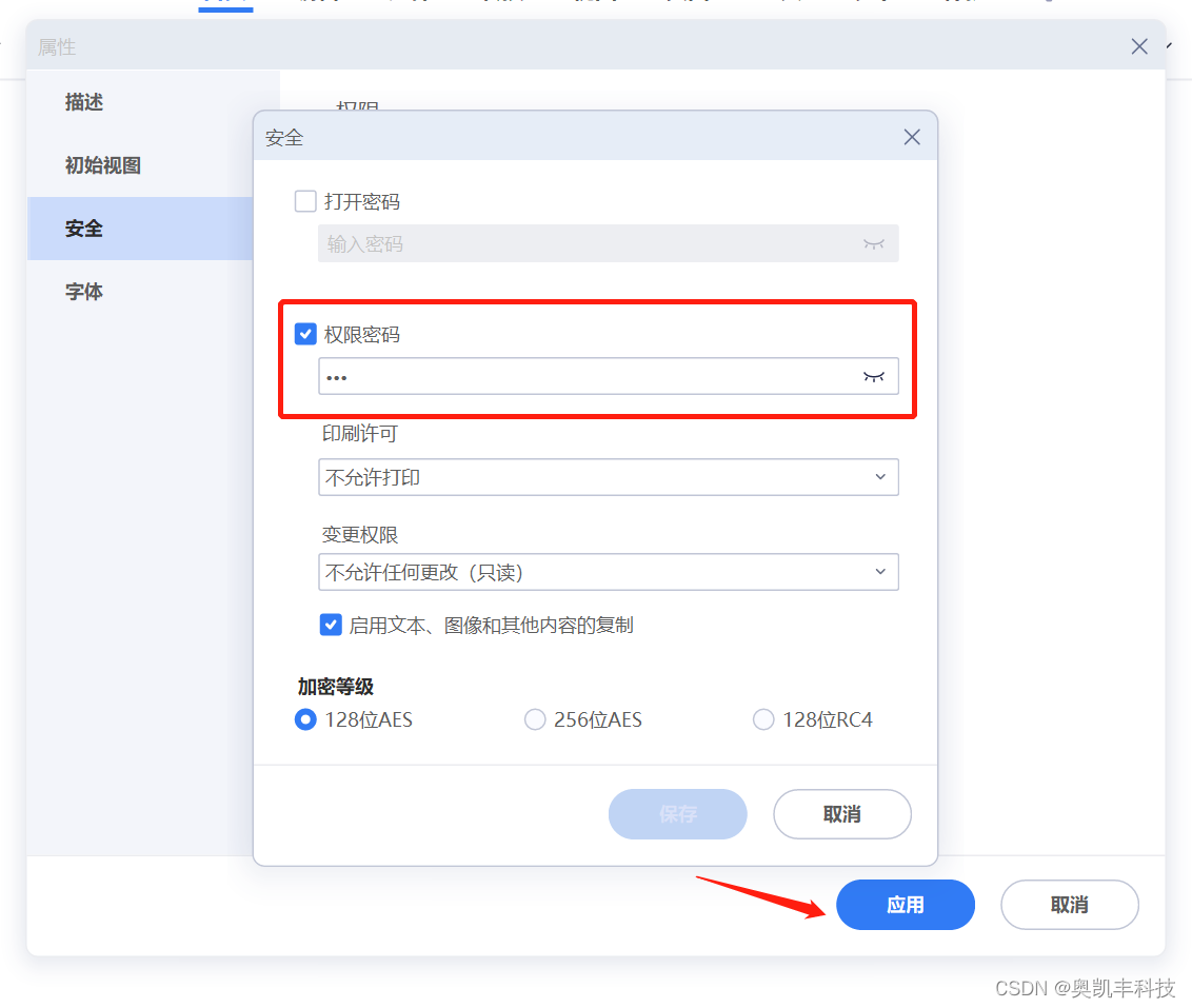 这是PDF文件自带的另一种加密方式,PDF文件可以直接打开,但是不能随意编辑,需要取消限制编辑才能够正常编辑文件。设置方法和打开密码差不多,点击【文件】-【属性】-【安全】,勾选权限密码选项并输入一个PDF密码,选择禁止操作选项之后即可完成加密。
