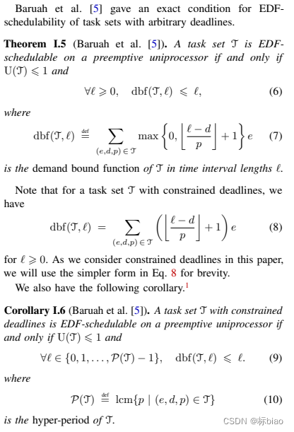 EDF的可调度性测试那个公式,其实跟固定优先级调度的分析方法RTA是类似(回想RTA的迭代过程),这个遍历上面的所有Q点,实际上就是类似于计算这些点的响应时间。这也难怪固定优先级调度的精确可调度性分析是NP-hard时间复杂度的证明过程,就是通过将固定优先级调度的精确分析先后RTA(里面用的是RBF请求上界函数,待会会讲)等价起来,然后,多项式时间规约到这个EDF的测试算法(已知道为NP-hard)中来呢(Fixed-Priority Schedulability of Sporadic Tasks on Uniprocessors is NP-Hard,Static-priority Real-time Scheduling: Response Time Computation is NP-hard)