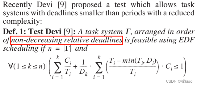 知识1:EDF调度中,任务集中任务提前按照截止期从小到达排序了,那么可调度性测试时候就是逐个任务往后测试即可(如果不排序,那就只能用上面说的精确可调度性测试了)。这个特性,很神奇(因为按道理说EDF是动态优先级,大截止期的任务也可能会干扰小截止期任务的呀,这个在下面的文章中应该能找到证明过程,我没有深究了,默认了),这一点跟固定优先级任务调度时候很像。下面的充分性(近似)测试算法就是利用了这个特性。