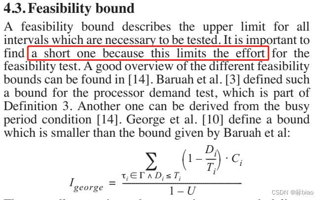 由于精确EDF测试需要测试的时刻点太多了,运行时间开销太大。因此有人(Efficient Feasibility Analysis for Real-Time Systems with EDF scheduling)提出,一方面,其实DBF的值不是每个时刻点都会发生变化(从上面的例子也可以看出来),那么我们只需要测试这些会发生变化的时刻点即可(很明显就是那些截止期除以周期整数倍的时刻这样子的点),但是这个好像每人提出过这个想法,如果想做,应该可以发个论文。另一方面可以没必要测试到最小公倍数那儿去,Igerge即为需要测试的最大时刻点,如下:(Efficient Feasibility Analysis for Real-Time Systems with EDF scheduling)其实跟响应时间分析RTA的不断提高测试效率是一样的发展过程。
