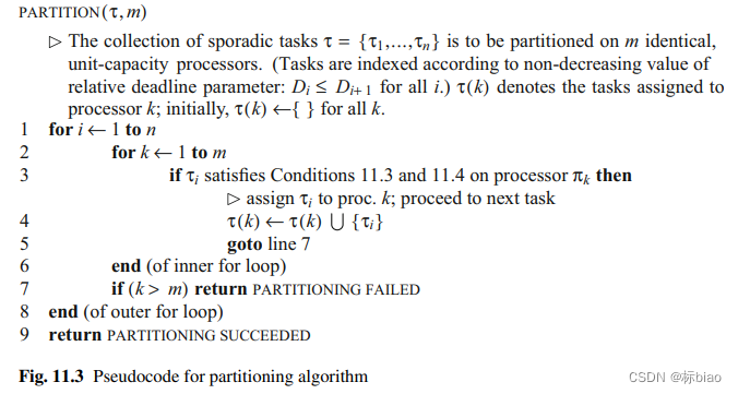 然后就剩下一步,sporadic任务在一个核上是否可调度的可调度性分析问题了。我们知道periodic任务(截止期等于周期的任务)在EDF调度下的可调度性测试就是总利用率小于1即可。但是sporadic任务可不一样了,它的可调度性测试时间复杂度很高,所以用了充分性测试算法2(附录2)。该算法的名字叫做 PARTION(),伪代码如下:来自论文(The Partitioned Multiprocessor Scheduling of Sporadic Task Systems)