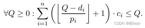 精确的EDF可调度性测试算法:需要在任务集所有周期最小公倍数内Q < lcm{p1,p2,... ,pn}(因为最小公倍数表示调度再次重来了),每个时刻是否都能满足所有任务(这里说作业,更为准确)的执行量需求(下面为什么是求和形式呢,因为EDF不像固定优先级调度,EDF是根据截止期的动态优先级,所以当前作业是可能被所有其它作业干扰的),如下:(EDF-schedulability of synchronous periodic task systems is coNP-hard)