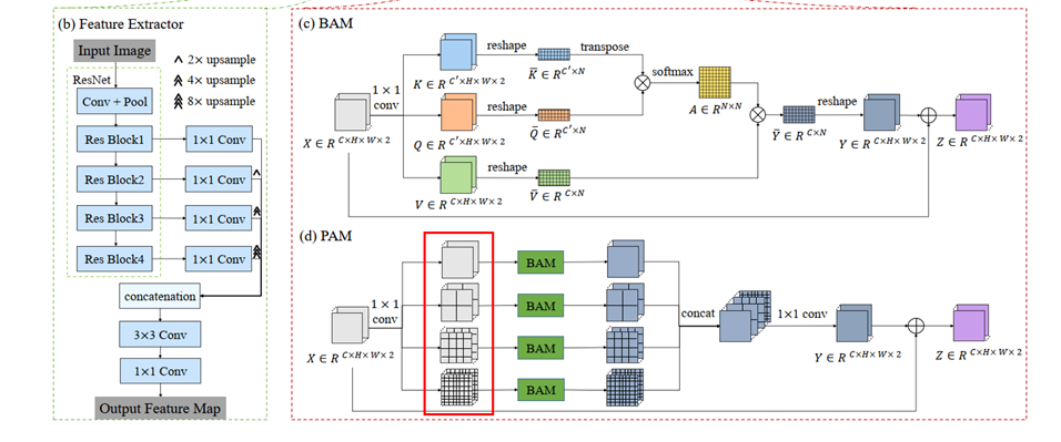 PAM有四个分支;每一个分支都将特征张量等分成一定尺度的若干子区域。在每个分支中,PAM对每个子区域的像素应用BAM,得到该尺度下的局部注意表示。然后,通过聚合四个分支的输出张量,得到多尺度的注意力表示。