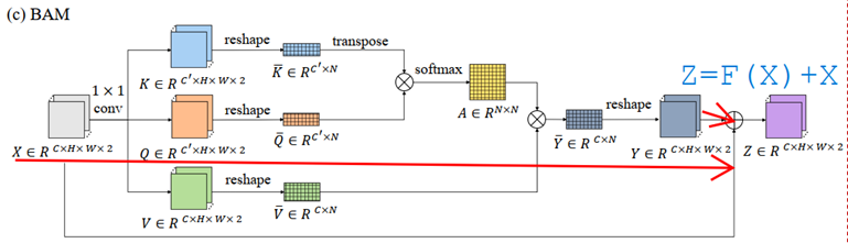 最后将注意力机制学到的特征张量Y(视为残差特征张量residual tensor)加上原始输入特征张量X得到BAM模块输出的updated feature map: