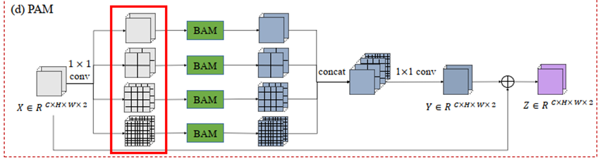 将输入特征张量(X∈RC×H×W×2)平均分为sxs的子区域(s=1,2,4,8,共四个分支),分别对四个分支实施BAM。对于每个分支分别对每个子区域(Rs,i,j ∈ RC× H/s × W/s ×2)实施BAM,在拼接。最后将四个分支拼接起来送到1x1卷积层,得到输出张量Y ∈RC×H×W×2。最后原始输入张量X加上最后输出的残差特征张量Y,得到PAM模块的输出Z ∈ RC×H×W×2。