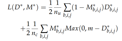 下标b, i, j (1 ≤ b ≤ B, 1 ≤ i ≤ H0, 1 ≤ j ≤ W0)分别是batch, height和width 的索引。nu, nc分别是没有变化的像素数,和变化的像素数。m是margin,我们设为2。参数化距离大于边距m的改变像素对,对损失函数没有贡献。(参考对比损失。)