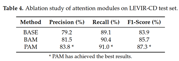 在可接受的计算开销下,我们提出的注意力模块将基线模型的f1得分从83.9提高到87.3。在一个公共遥感图像CD数据集上的实验结果表明,我们的方法优于其他几种先进的方法。