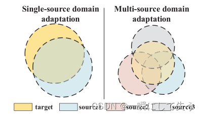 如下图所示,在单源无监督域自适应(SUDA)中,源域和目标域的分布不能很好地匹配。而在多源无监督域自适应(MUDA)中,由于多个源域之间的移动,很难匹配所有源域和目标域的分布。