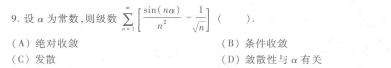 至此,我们已经学习了正项级数审敛法、任意项级数的绝对收敛和条件收敛、交错级数的莱布尼茨判别法,已经初步具备了判断任意一个级数敛散性的能力。而题目的考查往往也是比较综合性的,很多时候需要我们判断完级数收敛之后,仍需要我们判断它属于何种收敛(绝对收敛、条件收敛)。